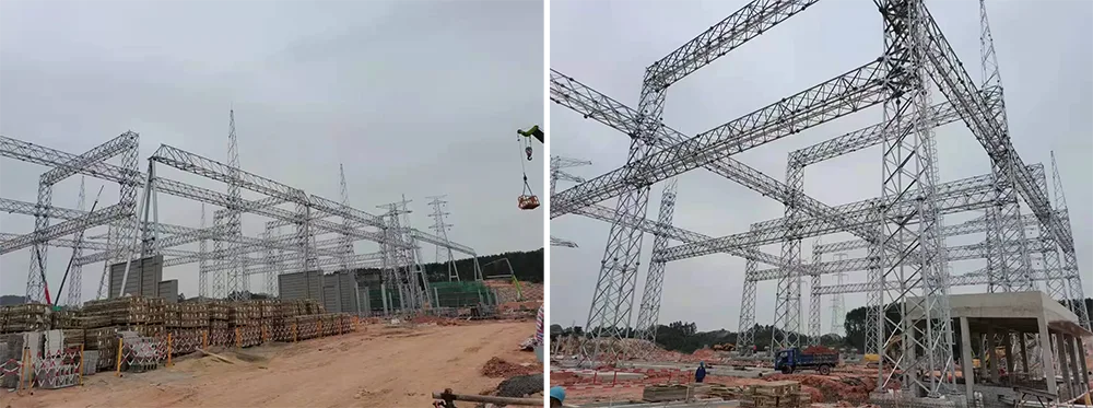 De er helt forskellige fra kraftoverførselstårne, som kun bruges til at understøtte luftledninger. Krafttransmissionstårne tjener kun som støtte til at transmittere højspændingselektricitet fra punkt A til punkt B uden spændingstransformation eller effektstyring. I modsætning hertil er understationsstålkonstruktioner komplette faciliteter, der integrerer spændingstransformation, strømstyrings- og strømfordelingsfunktioner, udstyret med kernekomponenter såsom hovedtransformatorer, koblingsudstyr og beskyttelsesanordninger. De er uundværlige behandlings- og afsendelsescentre i kraftoverførselsprocessen. De to arbejder sammen om at danne et komplet krafttransmissionsnetværk.